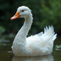 a body of water. The duck is predominantly white, with