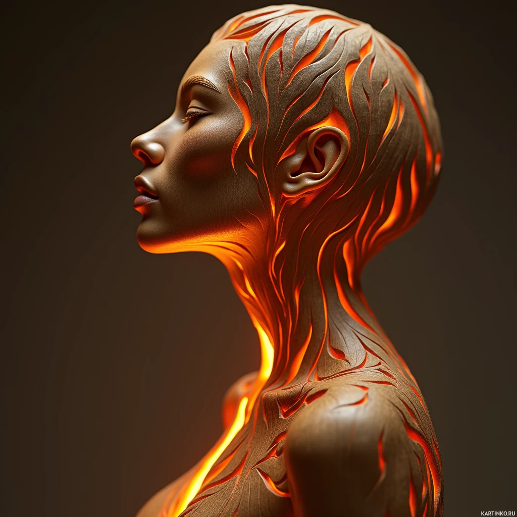Картинка демонстрирует человека с закрытыми глазами. На лице – задумчивое выражение, макияж включает темную подводку и румяна нежных розовых оттенков. Волосы средней длины, словно зачесаны назад или собраны вверх. Отличаются выразительные брови и пухлые губы. Захватывающий элемент этого портрета – тело и лицо покрыты материалом, напоминающим застывшую лаву. Цвет переходит от красного у макушки к желтому в области груди. Этот материал также присутствует на шее, словно стекает по коже, создавая эффект плавления. Фон картинки темный и безликий, создавая резкий контраст, который подчеркивает главную фигуру. Освещение сосредоточено на лице и плечах, выделяя текстуру и детали материала, покрывающего лицо человека.
