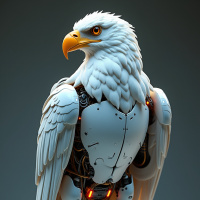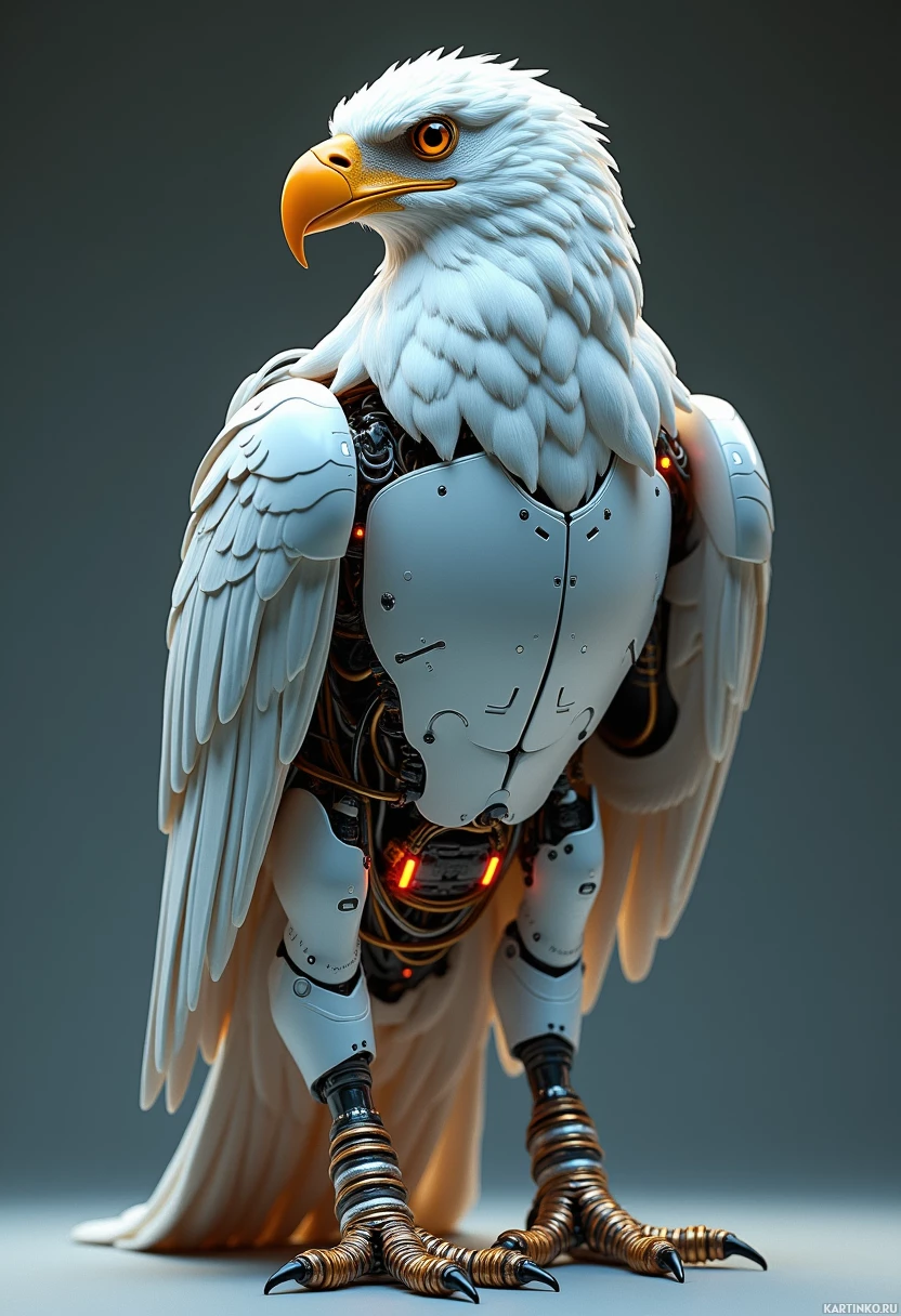 На картинке изображён роботизированный орёл. Он стоит на двух лапах, его тело – искусственное, с металлическим покрытием. Голова орла сохранилась, и на ней видны клюв и острые когти. Крылья широко расправлены, что указывает на способность к полёту.