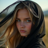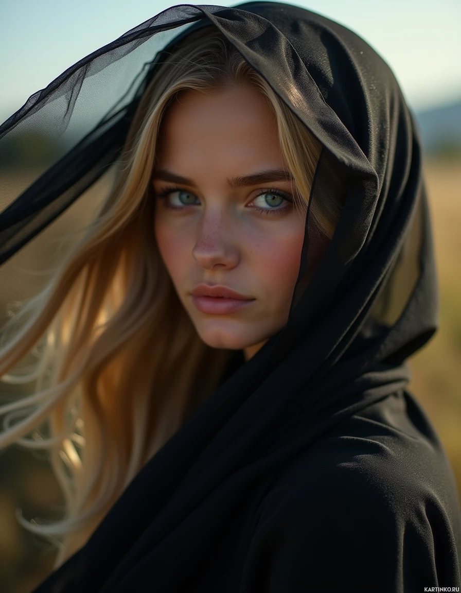 На картинке изображена девушка в черной хиджабе, закрывающем голову и шею. У нее светлые волосы, светлая кожа и выразительные голубые глаза. Она смотрит прямо в камеру с нейтральным выражением лица. Фон – естественный пейзаж с зеленой растительностью, что указывает на то, что фото сделано на открытом воздухе в светлое время суток.