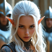 The image depicts a fantasy-themed character with white hair and pointed ears, suggesting an elf-like appearance. The individual has prominent tattoos visible on their skin. They are wearing armor that is open at the chest, revealing bare skin underneath. There are other figures in the background, also dressed in fantasy or warrior attire, indicating a thematic context of conflict or battle.