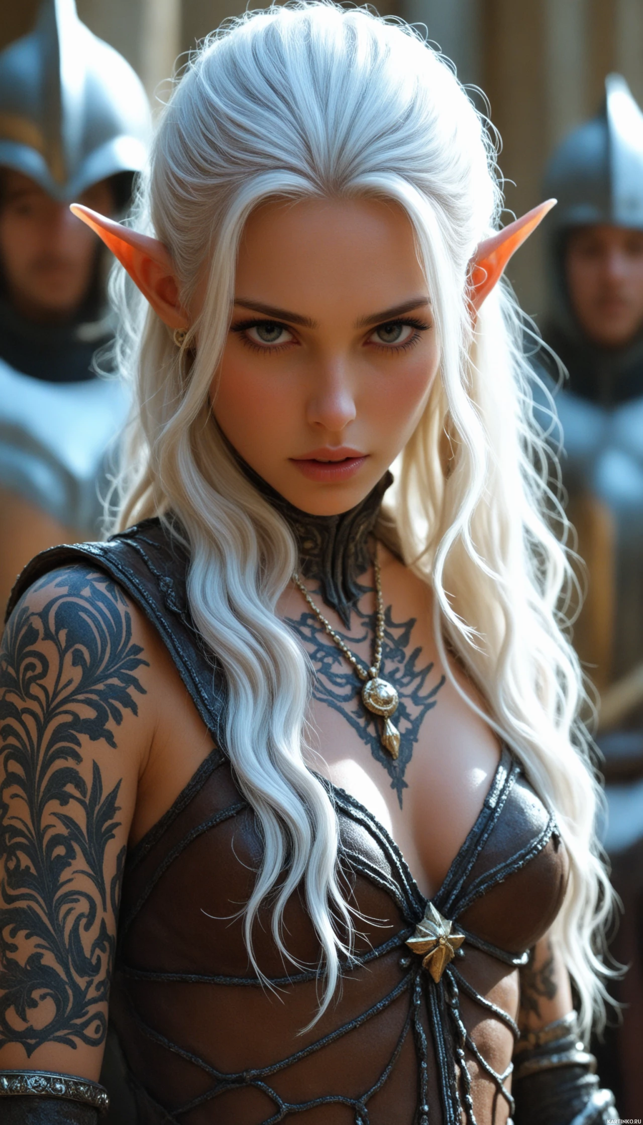 На картинке изображён персонаж в стиле фэнтези с белыми волосами и заострёнными ушами, что указывает на эльфийские черты. На коже видны заметные татуировки. Он одет в доспехи, открывающие грудь и обнажённую кожу. На заднем плане видны другие фигуры, одетые в фантазийные или боевые доспехи, что указывает на тематику конфликта или сражения.