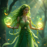 green hair, dressed in an elaborate, ethereal green dress. She is surrounded by nature elements and