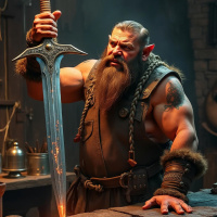 a large sword, which is prominently displayed in the foreground of the picture. He is set within an environment that suggests a crafting or forge workshop, indicated by tools and materials scattered around him on tables and benches. His expression is intense, suggesting concentration or perhaps dissatisfaction with