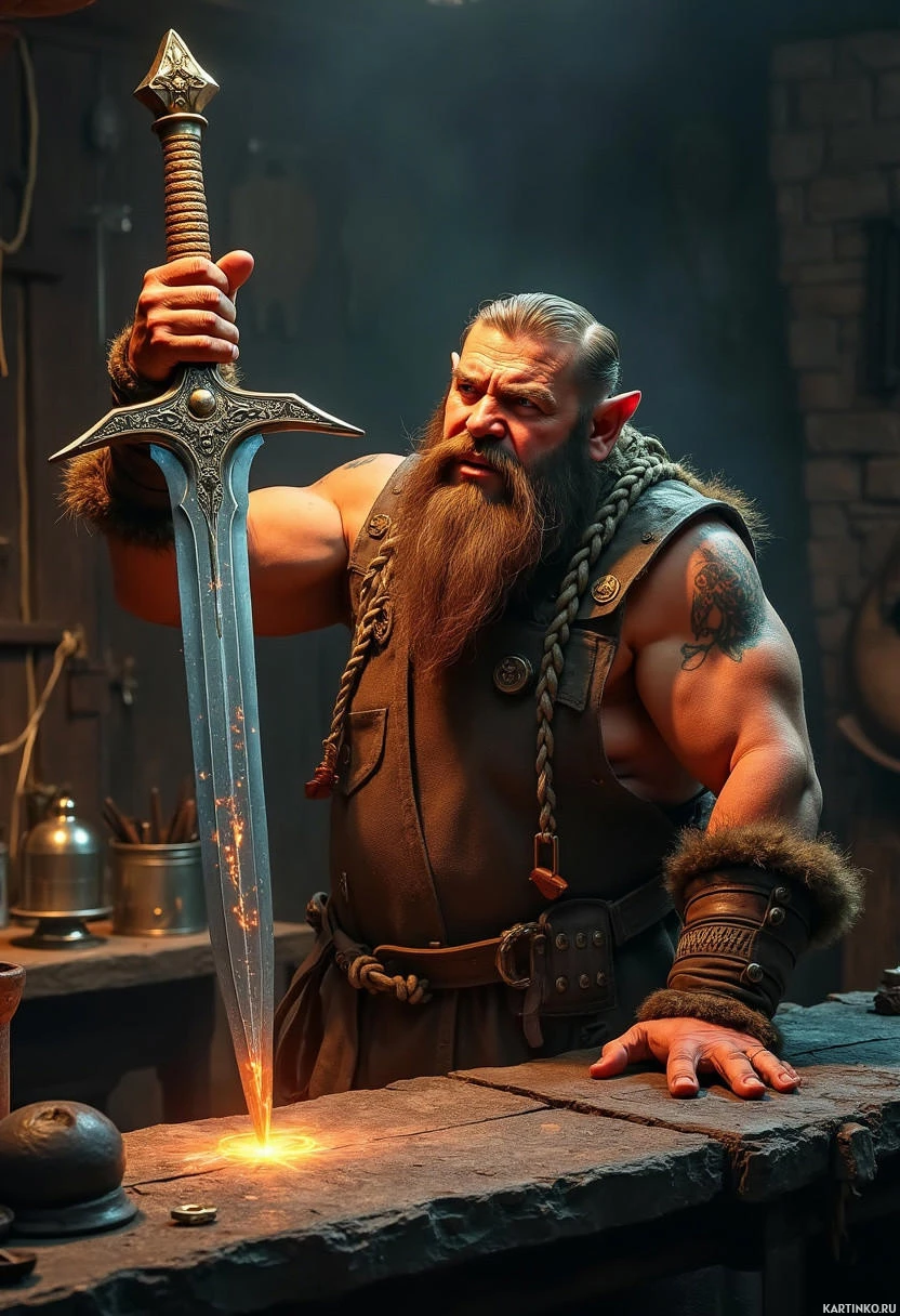 The image depicts a figure that appears to be a dwarf, identifiable by the fantasy elements and characteristics often associated with such figures. This character is holding