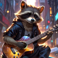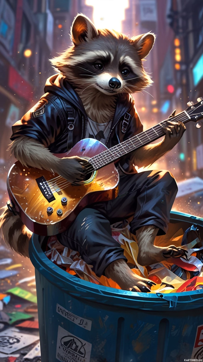 raccoon character sitting on a pile of trash. The raccoon is holding a guitar and appears to be playing or about to play it. The setting looks like