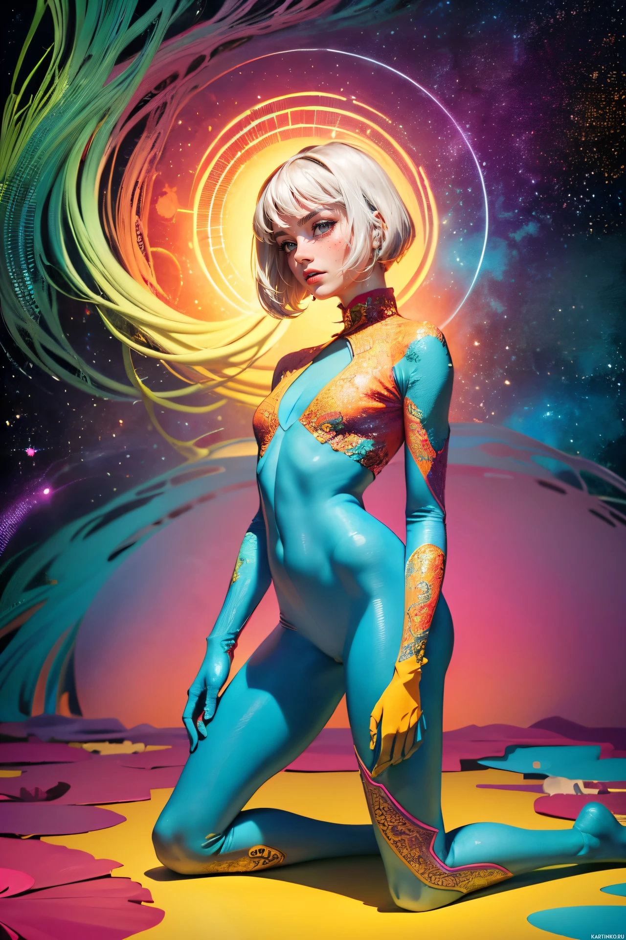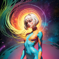 the vibrant colors around her. Her attire appears to be futuristic or fantasy-inspired, with a bodysuit that resembles a second skin in