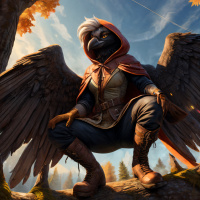 На картинке изображён антропоморфный персонаж, животное с птичьей внешностью, напоминающее ворона или воробышка. У него широко расправлены большие крылья, он сидит на ветке дерева или скалистом выступе. Задний план создает впечатление идиллии или фантастической природы: видны осенние листья, возможно, водопад или река. На персонаже надет капюшон, что придает ему таинственный вид. Свет и тени проработаны очень тщательно, благодаря чему сцена выглядит объемной.