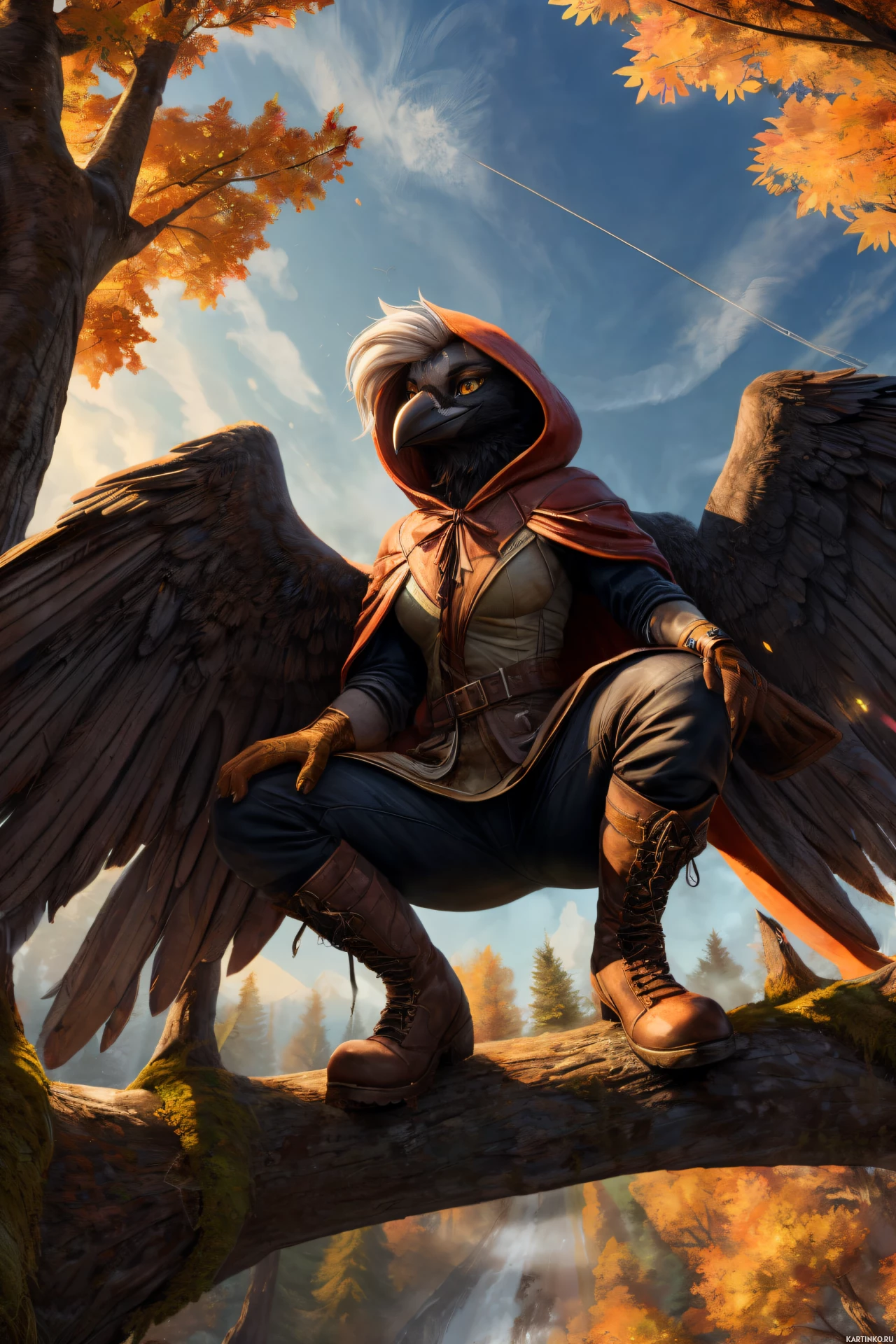 The image depicts an anthropomorphic animal character with a bird-like appearance, specifically a raven or crow given the context. This character has large wings spread wide and is perched on what appears to be a tree branch or rocky outcropping in a setting that could be described as idyllic or fantastical due to the presence of autumnal foliage and possibly a waterfall or river in the background. The character's clothing includes a hood, suggesting a cloaked or enigmatic appearance. The lighting and shadows are meticulously rendered, giving depth to the scene.