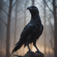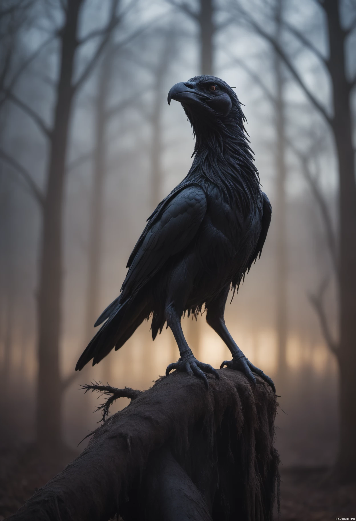 The image features a large, dark bird with prominent feathers perched on what appears to be