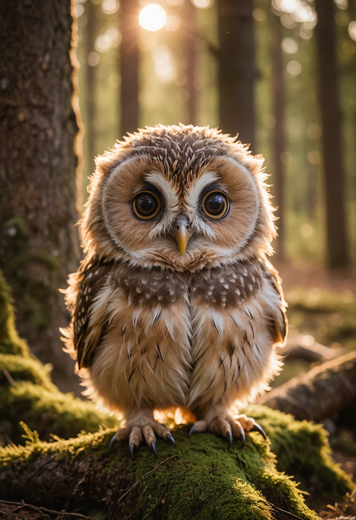 На картинке изображена сова, сидящая на поваленном, поросшем мхом бревне, вероятно, в лесу на рассвете или закате, судя по теплому освещению. Сова повернута немного вправо, её голова повернута, а глаза смотрят вперёд. Перья детализированы различными оттенками коричневого, бежевого и белого с мелкими узорами, что может указывать на принадлежность к виду с пёстрым оперением. Фон мягко размыт, что акцентирует внимание на сове как на главном объекте.