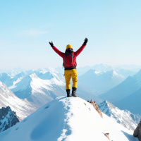 the summit of a mountain. He is facing away from the camera, and his arms are raised in what appears to be a gesture of triumph or celebration. The mountain peak is covered with snow, and there's a gradient effect that adds