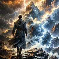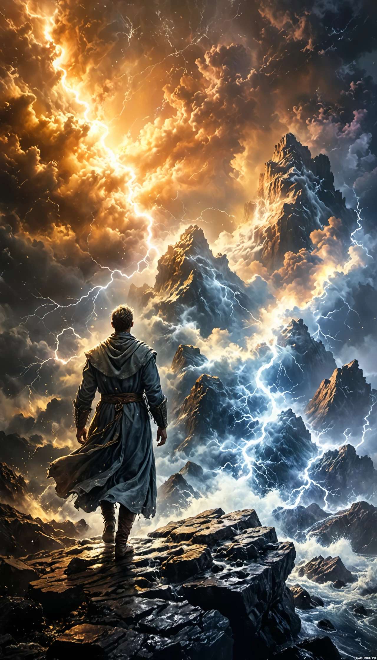 На картинке запечатлён мужчина, стоящий на каменистой местности на фоне впечатляющего неба. Сзади видно, что на нём длинный плащ или накидка, одна рука лежит на бедре, другая свободно свисает. Он смотрит на горный хребет, занимающий основную часть картинки. Над горами нависают грозные тучи, будто там сверкает молния, предвещая мощную бурю или бурные погодные условия. Общий стиль произведения напоминает фэнтези или приключенческие мотивы благодаря насыщенным цветам и динамичной композиции.