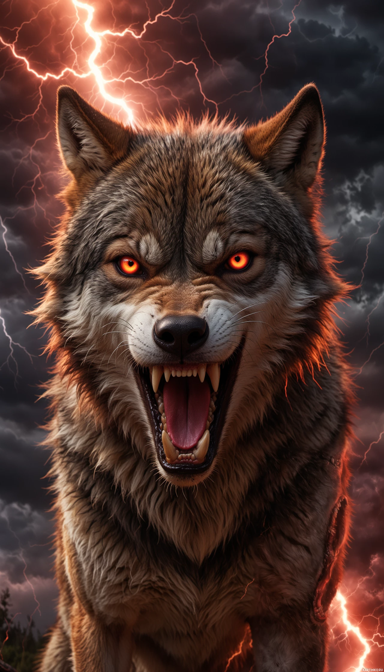 The image features a depiction of a wolf. The wolf appears to be in motion, possibly running or howling, with its mouth open as if growling or barking. Its eyes are glowing red, which is not typical for actual wolves but suggests an intense or fierce expression. The background is dramatic, with