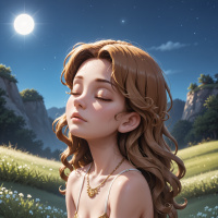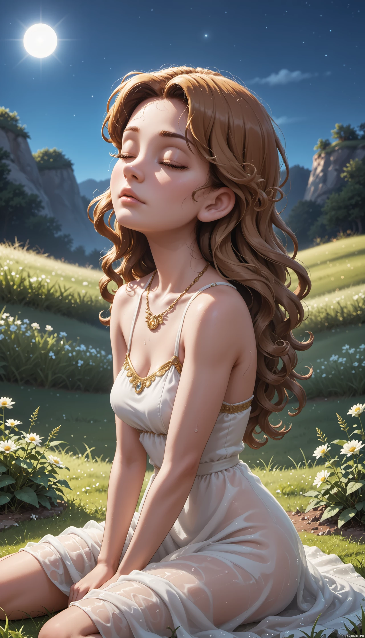 a young woman with closed eyes, sitting on her knees in a natural setting. She has long, flowing hair and is wearing
