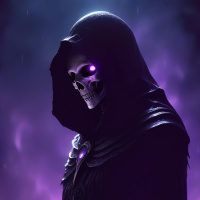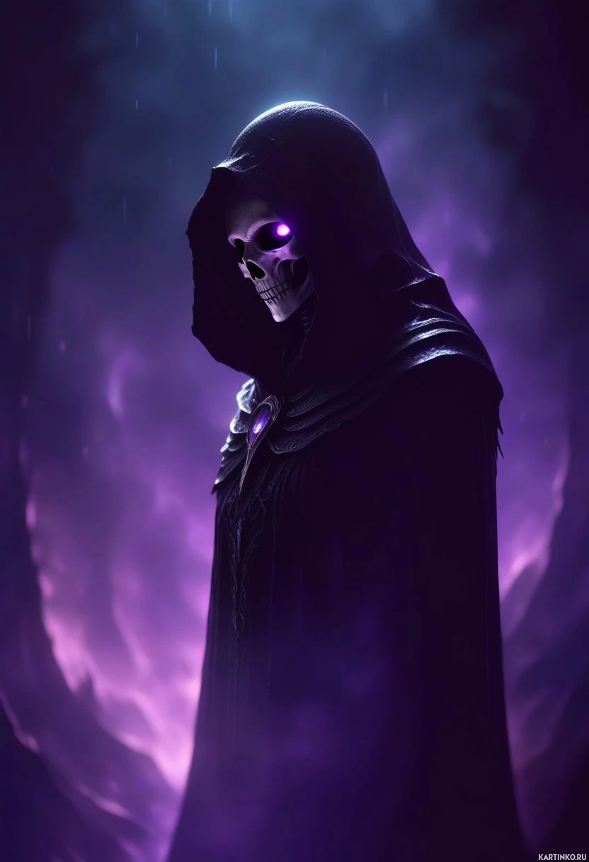 a fantasy character dressed in dark clothing, including a hood and a cloak. Visible on the person's head is a skull, which is often associated with themes of death or horror. The background has a purple-hued mist, adding to