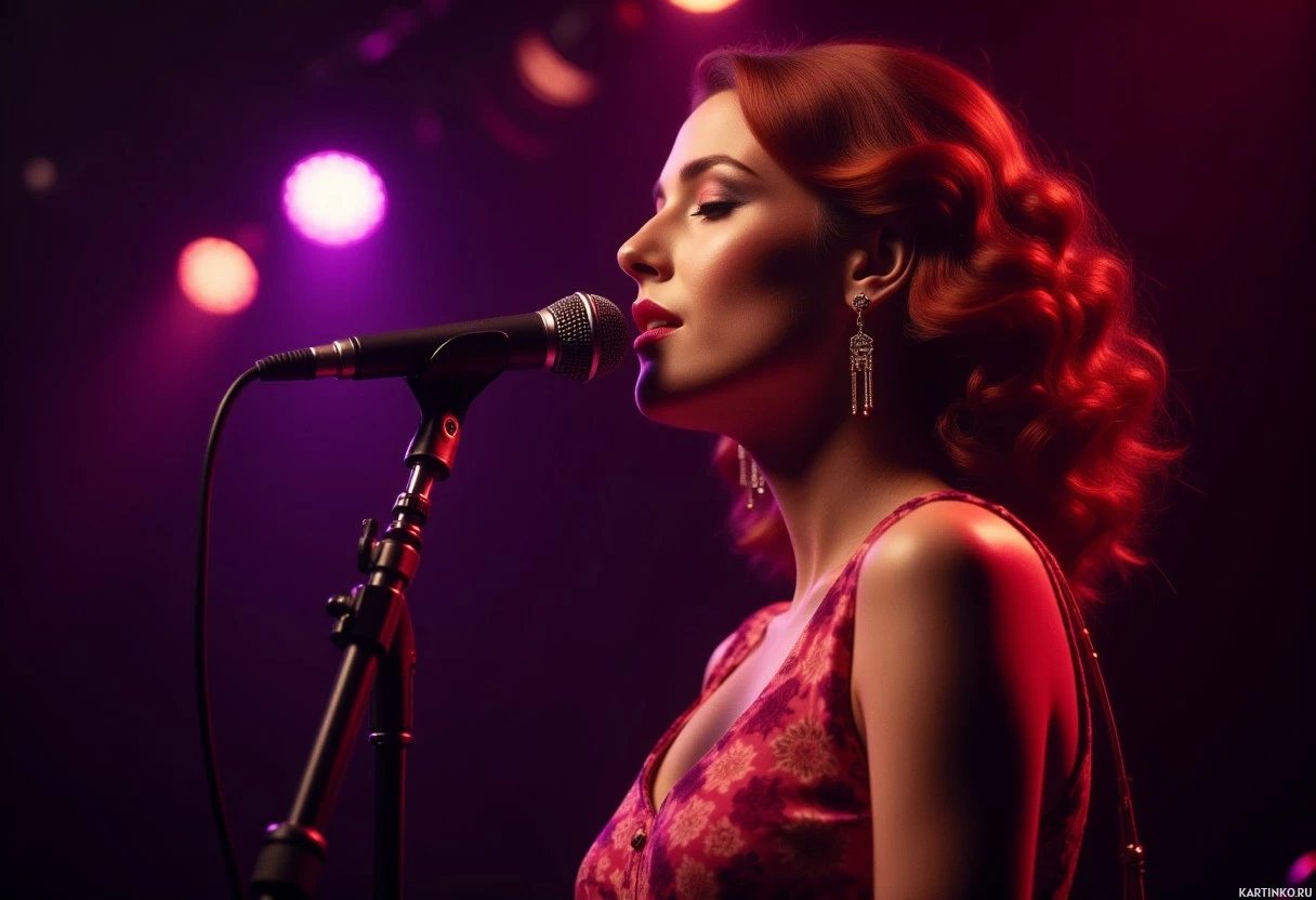 На картинке изображена женщина с рыжими волосами. У неё закрыты глаза, и она стоит перед микрофоном, вероятно, поёт или выступает на сцене. На ней фиолетовое платье, которое добавляет яркий акцент в сцену. Место действия – помещение, скорее всего, концертный зал или подобное пространство, предназначенное для живых выступлений.