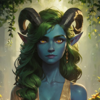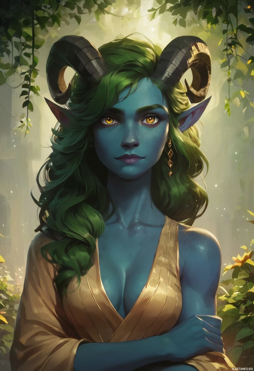 game universe, which includes pointed ears and ram-like horns. Her attire consists of a yellow garment that could be interpreted as robes, and she has