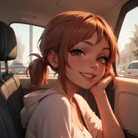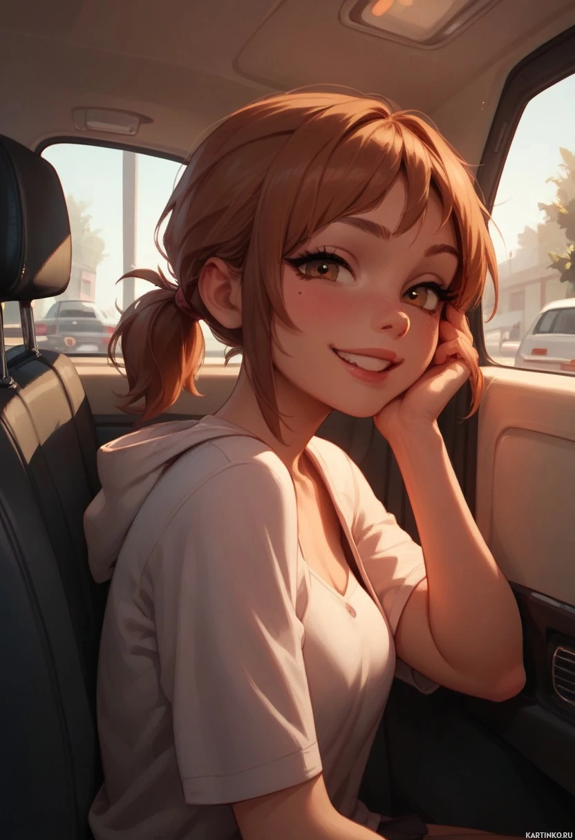 brown hair tied into pigtails and is wearing what appears to be a casual white top. The car's interior is visible, with the dashboard in front of her, and outside the car, there are blurred outlines suggesting