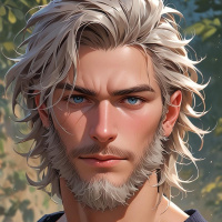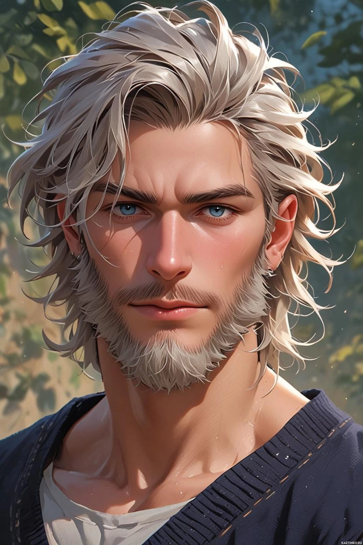 blue eyes and is wearing a sleeveless top that leaves his muscular arms visible. His expression is intense, with furrowed brows and lips slightly apart as if he's deep in thought or about to speak. The background appears to be an artistic representation of