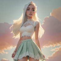 На картинке изображен трехмерный анимированный персонаж, похожий на девушку с длинными белыми волосами. На ней топ без рукавов и юбка, выполненные в светлых пастельных тонах, перекликающихся с мягкими оттенками ее волос. На заднем плане – спокойный закат или восход, с облаками, светящимися теплыми тонами у горизонта.