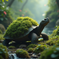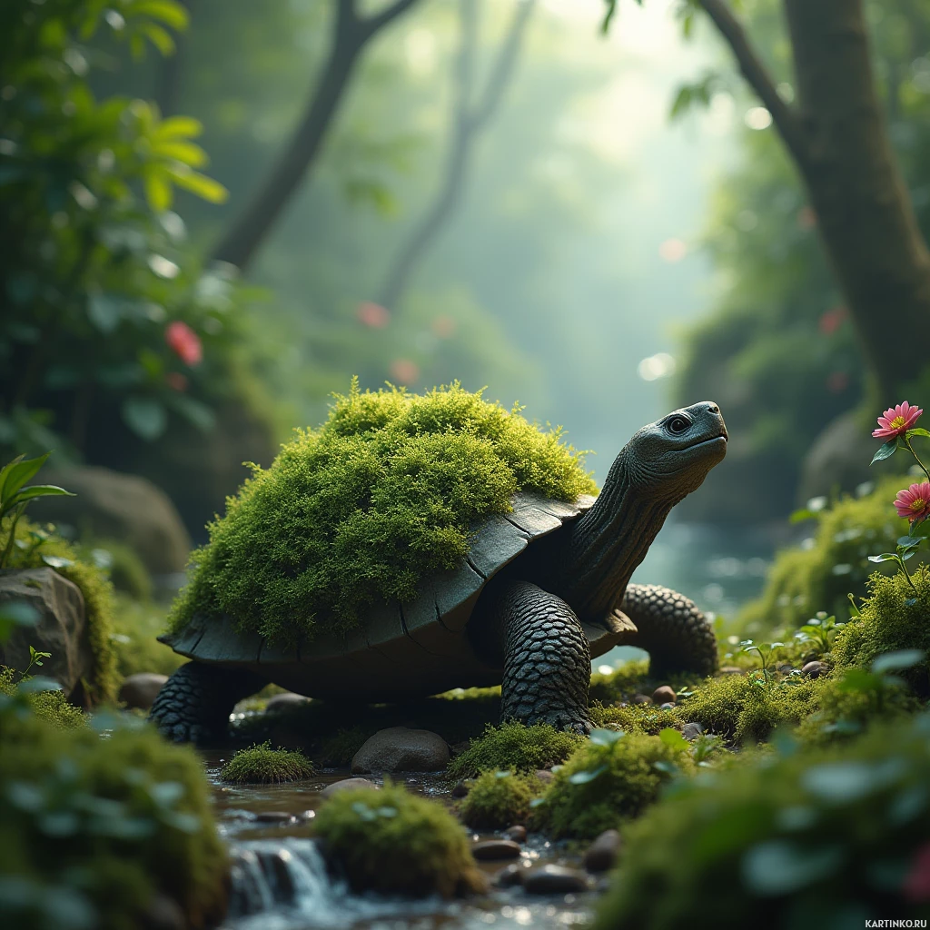 На картинке черепаха идет по густому зеленому лесу. Черепаха выглядит крупной, с панцирем темно-серого цвета и более светлыми пятнами. Она движется на четвереньках в левую часть кадра, проходя мимо небольшого ручья, бегущего по камням. На камнях и на листве вокруг растут розовые цветы. Лесной пол устлан мхом, а над головой — плотная крона деревьев. Освещение говорит о том, что это может быть раннее утро или поздний вечер, так как сцена освещена мягким, рассеянным светом.