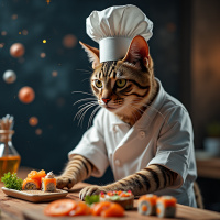 In the image, a cat is seen wearing a chef's hat and holding a knife, preparing to serve food on a plate. The cat is surrounded by various kitchen items such as bottles, a wine glass, and a bowl containing more food. The setting appears to be a kitchen with shelves in the background, suggesting an indoor environment designed for cooking or dining.