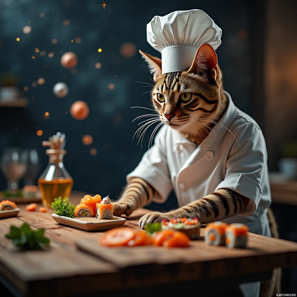 На картинке кот в поварском колпаке с ножом в лапе, готовый подавать блюдо на тарелке. Вокруг него - разнообразные кухонные принадлежности: бутылки, бокал вина и миска с едой. На заднем плане видны полки, что указывает на обстановку кухни, предназначенной для готовки или обедов.
