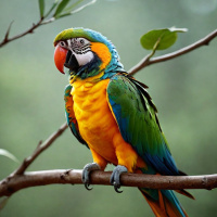 На картинке – яркий попугай, примостившийся на ветке. У птицы необычная морда: зелёная голова, жёлтое тело и ослепительно-голубые крылья. Лапками она крепко держится за веточку, будто отдыхает или внимательно осматривает окрестности. Фон размыт, но видно, что это естественный ландшафт с деревьями и, возможно, туманным лесом, что создаёт спокойную атмосферу картинки.