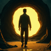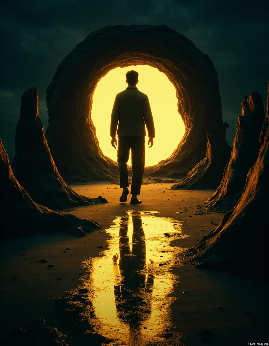 На картинке изображен силуэт человека, идущего к освещенному круглому отверстию в, по-видимому, пещере или скальной породе на закате. Свет создает ощущение теплого золотистого сияния, а небо отражает переход от дня к ночи. Земля влажная, что говорит о недавних приливах или дожде, и по обеим сторонам тропинки, ведущей к отверстию, разбросаны камни.