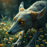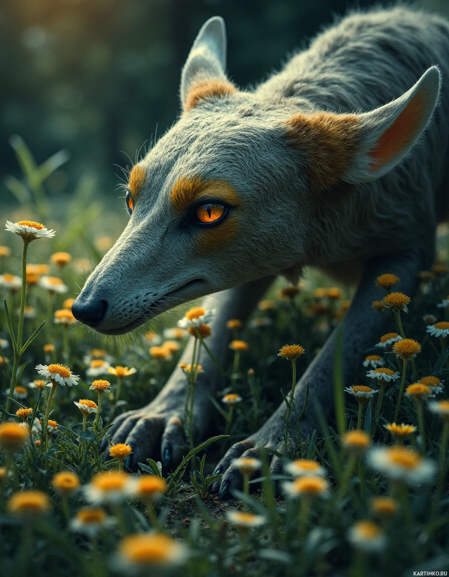 На картинке запечатлён волк, словно в движении. У него выдающийся нос и большие глаза, а шерсть в основном белая с рыжими пятнами на теле. Уши волка насторожены, и он смотрит вниз, возможно, на еду или на что-то интересное. На заднем плане – лесная местность с деревьями и густой растительностью. По всей сцене цветут цветы, в основном жёлтые, что может говорить о весне или начале лета. Освещение мягкое и рассеянное, что указывает на рассвет или закат, судя по тёплым оттенкам на шерсти волка и слишком тёмному для дневного света небу.