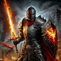 medieval armor. This figure is holding two swords crossed before them, suggesting they might be prepared for battle or ceremony. They are wearing a helmet and chainmail, which indicates that this character may be a knight or someone of significant status within the context of the scene. The background includes what appears to be flames or fire, adding to the intensity of the image and possibly indicating a fierce or intense