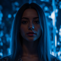 a young woman with short blue hair looking off to the side, her expression is calm and slightly curious. She has light skin and appears to be indoors in a dimly lit room with blurred shapes that might suggest a forest or