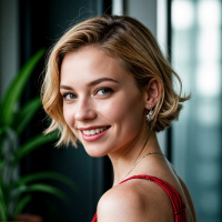 The image shows a woman facing away from the camera with her head turned to the side. She has short, blonde hair and a noticeable smile on her face. She is wearing what appears to be an off-shoulder red dress or top, which could indicate a formal or semi-formal attire. Her left hand is slightly raised, as if gesturing in conversation. In the background, there's a hint of greenery and what seems to be a plant on a tabletop, suggesting the setting might be indoors with some decorative plants.