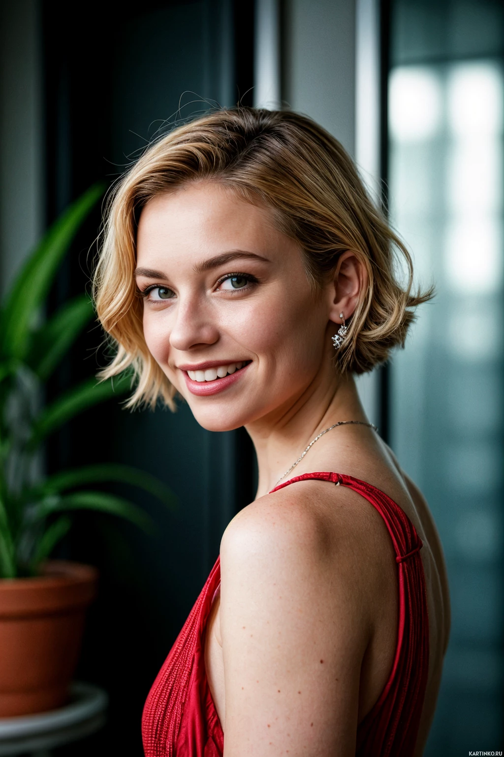 На картинке изображена женщина, стоя спиной к камере, с повернутой головой. У нее короткие светлые волосы и заметная улыбка на лице. На ней, похоже, красное платье или топ с открытыми плечами, что может указывать на формальный или полуформальный наряд. Левая рука слегка приподнята, будто она жестикулирует в разговоре. На заднем плане видны зеленые растения и, кажется, цветок на столе, что позволяет предположить, что действие происходит в помещении с декоративными растениями.