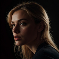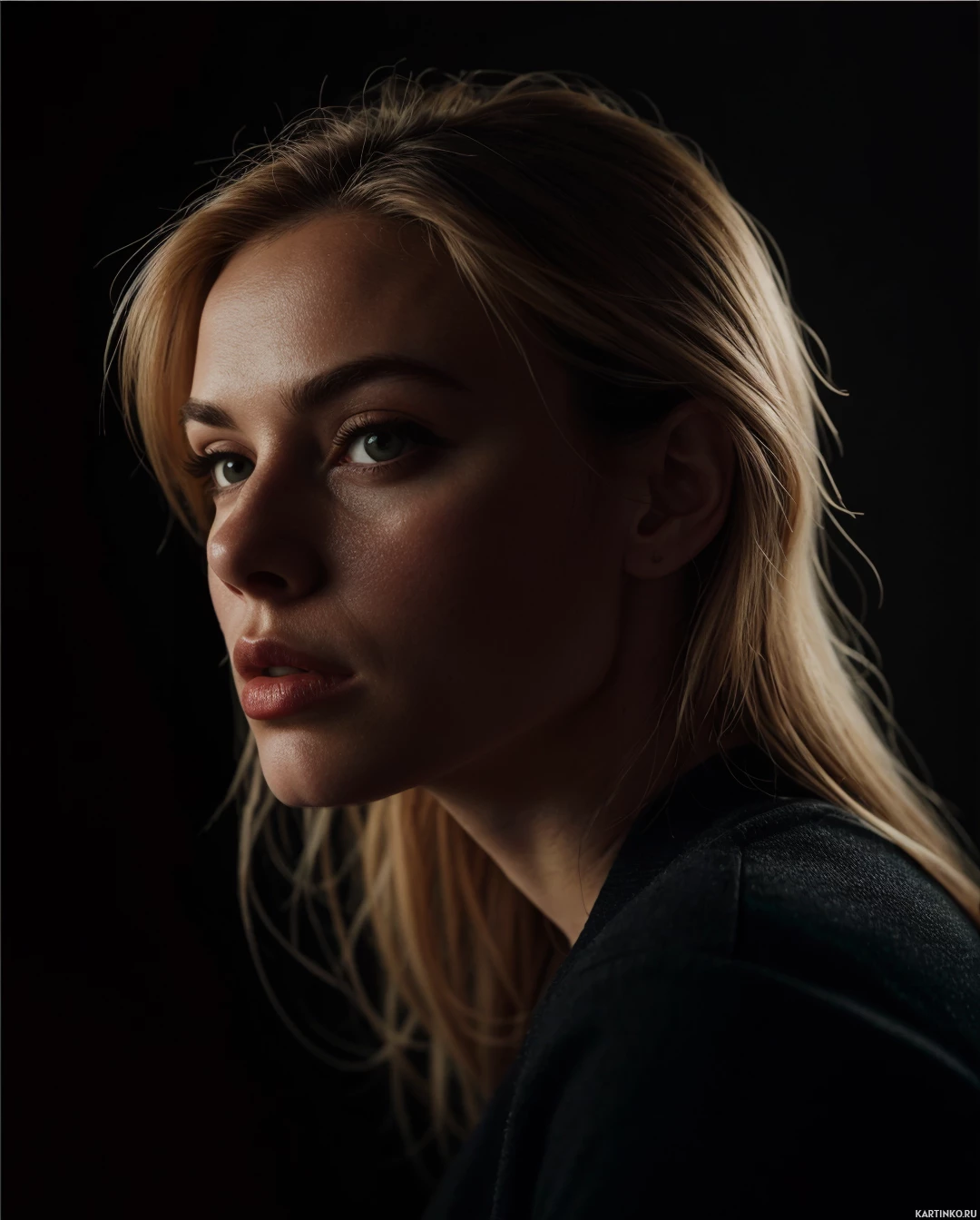 a moody atmosphere around her. The background is nondescript, focusing the viewer's attention on her face and expression.