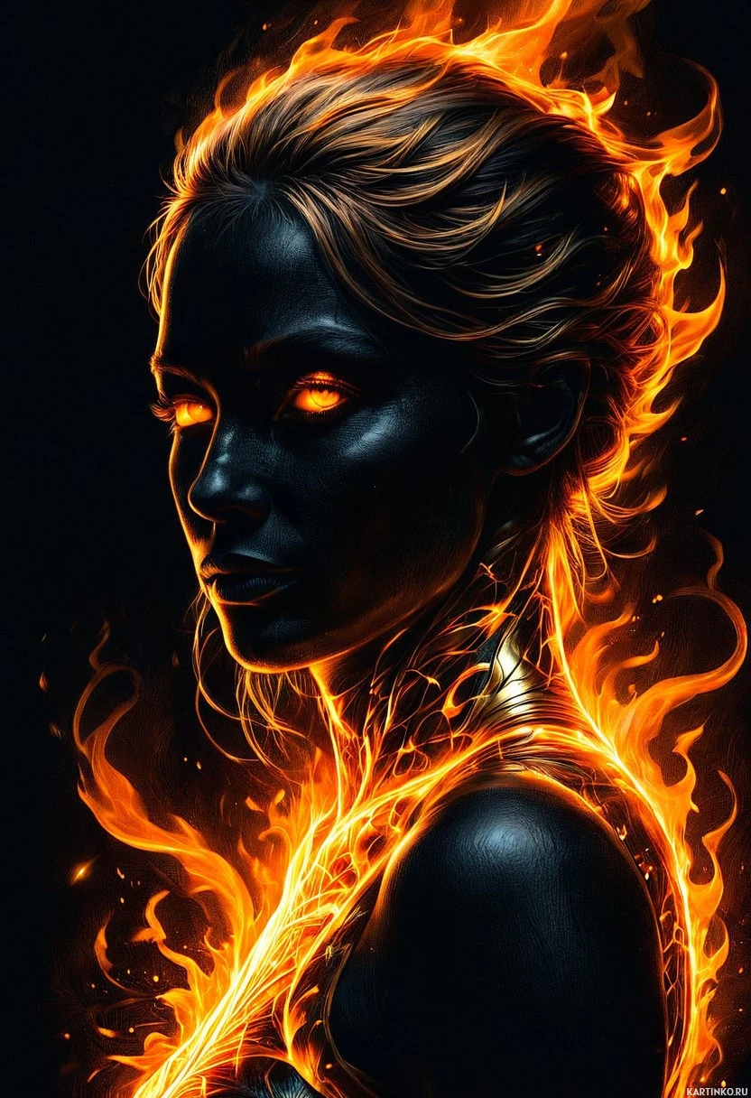 the vivid colors of the flames and her hair. The overall mood of the image suggests a character with a connection or ability to harness flames, possibly hinting at themes of power, control, or even danger related to fire.