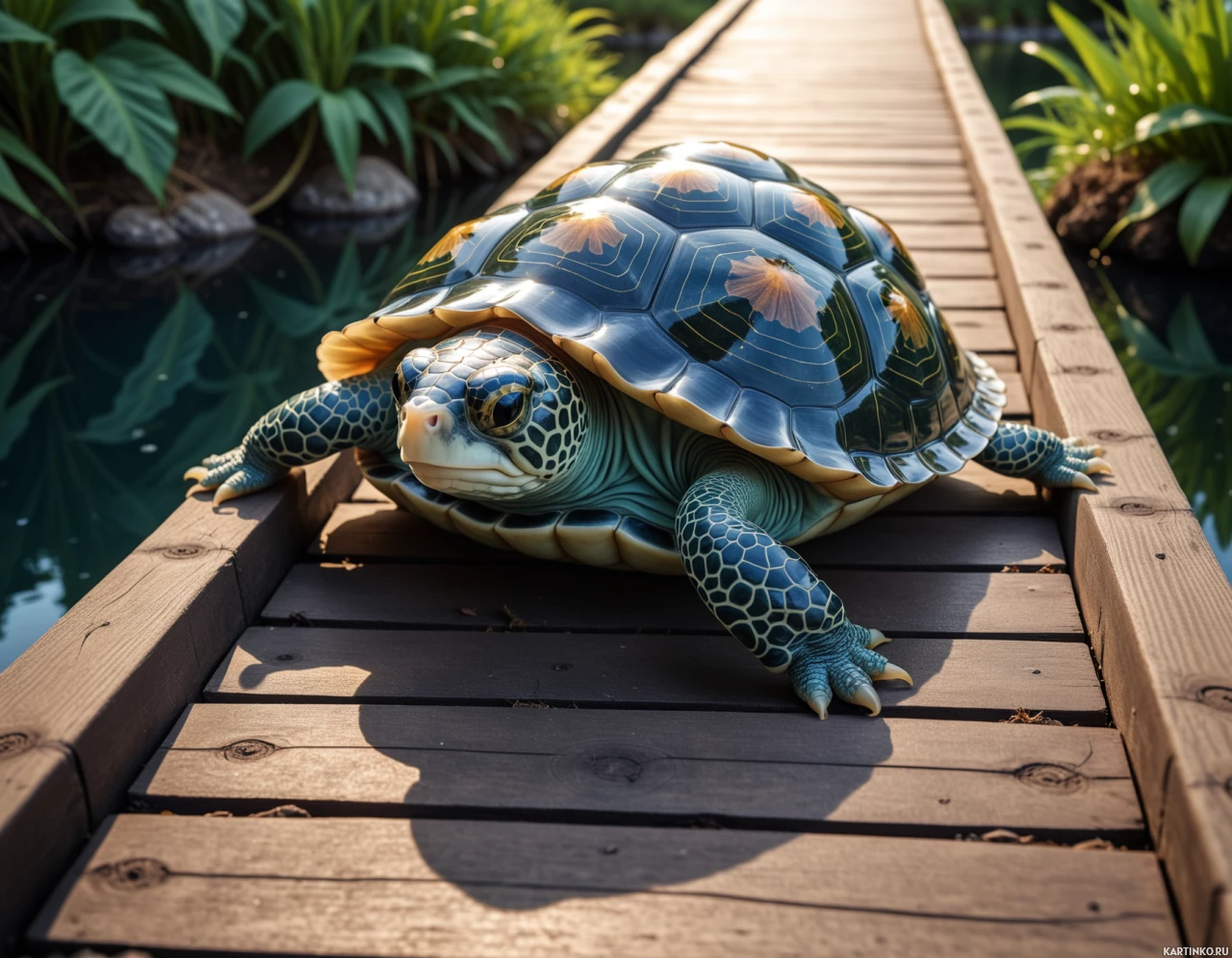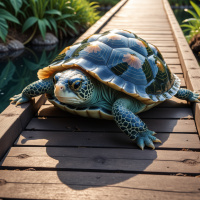 a wooden bridge. The turtle appears to be moving slowly across the bridge, possibly walking. It has a shell with shades of brown and green patches, which are