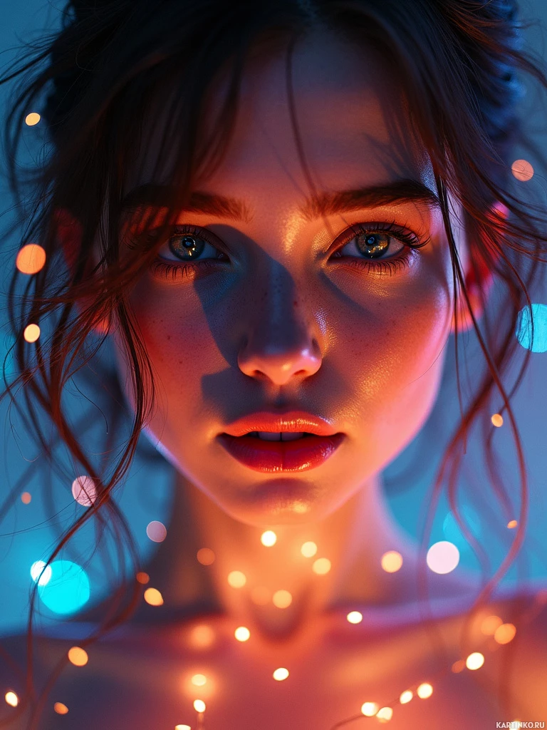 a natural glow, possibly due to the lighting. The contours of her cheeks and the shape of her eyes suggest a youthful appearance. In the lower half of the image, there are numerous small particles or dots that create an effect similar to sparkles or stardust emanating from her lips and spreading outward. These elements give the impression that her smile is creating a magical or enchanting atmosphere around her. The lighting used in the photograph is such that it highlights the textures on her skin and hair, adding depth and dimension to the image.