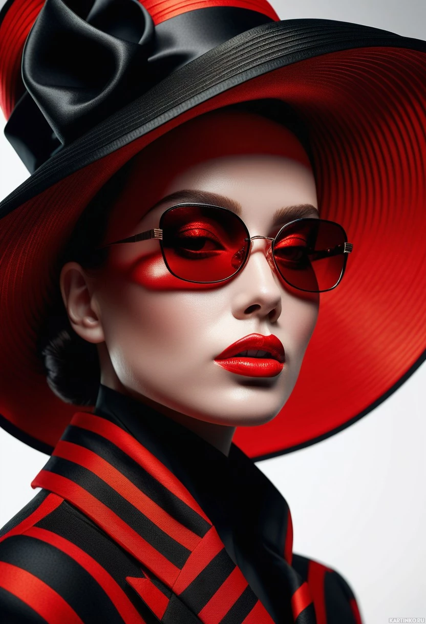 red stripes running down the sides of it, creating a bold statement in the image. The background is plain white, which contrasts with her vivid attire and accessories, making her the focal point of the photograph.