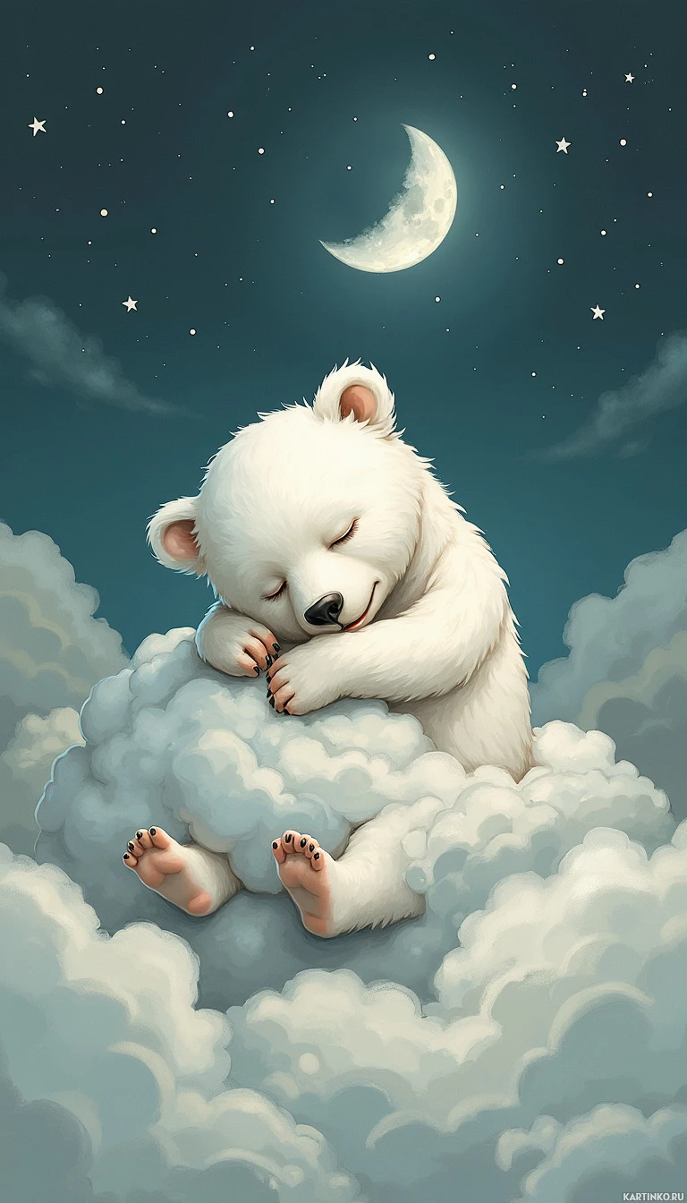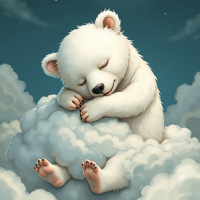 baby bear is curled up, with its eyes closed, and it appears to be dreaming or at rest. It's nestled among soft clouds that glow with a warm, ethereal light, suggesting a calm and