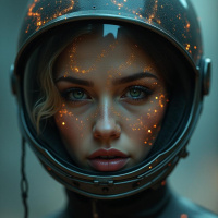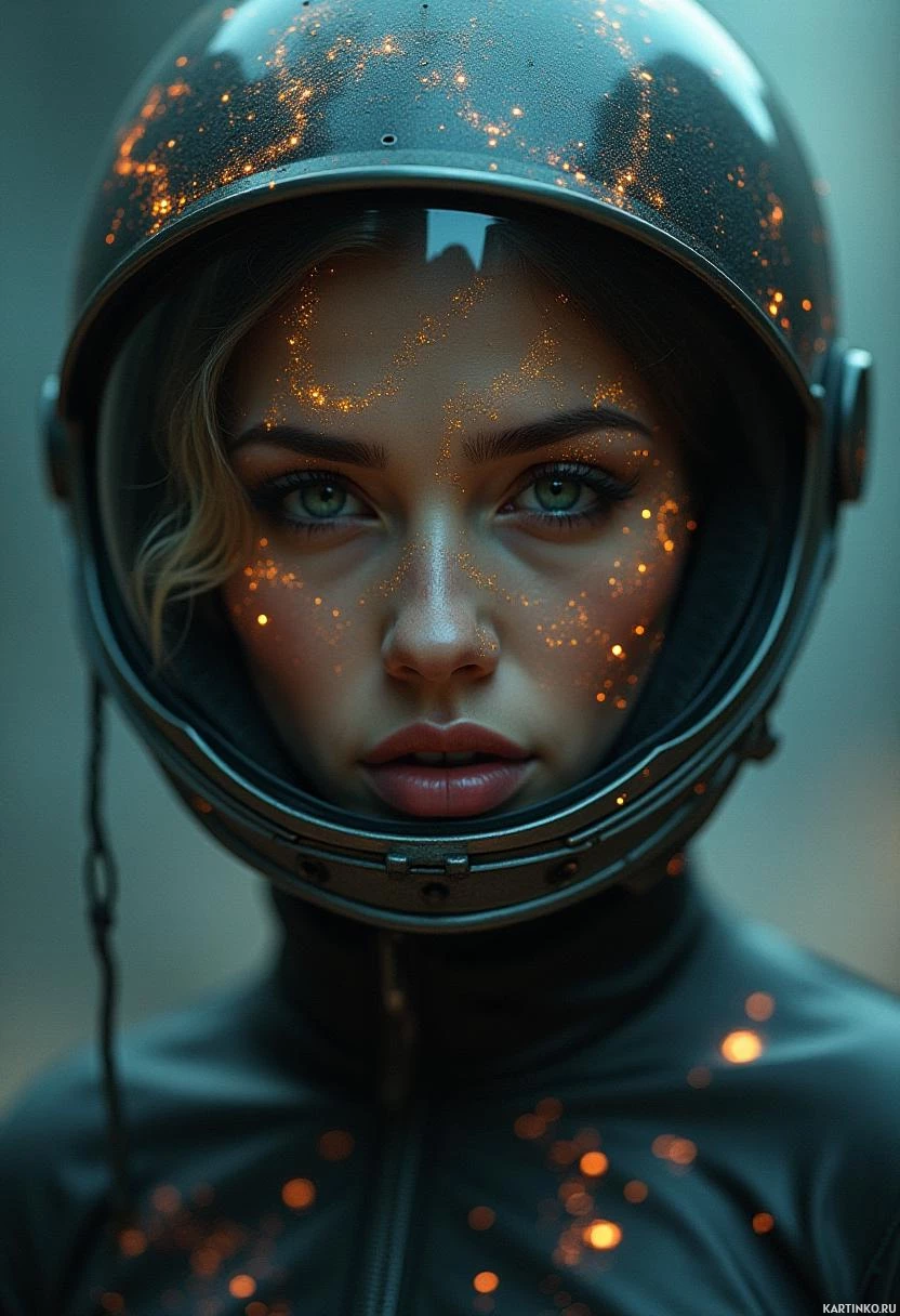 a young woman wearing a space helmet. The helmet has a visor that she appears to be peering through. Her complexion is fair and her eyes are looking directly at the camera with