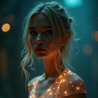 a crop top that has a unique design: it's adorned with small, shimmering embellishments that could be interpreted as stars or sequins, giving it a festive or decorative look. The lighting around her is low and ambient, casting soft shadows and adding to