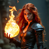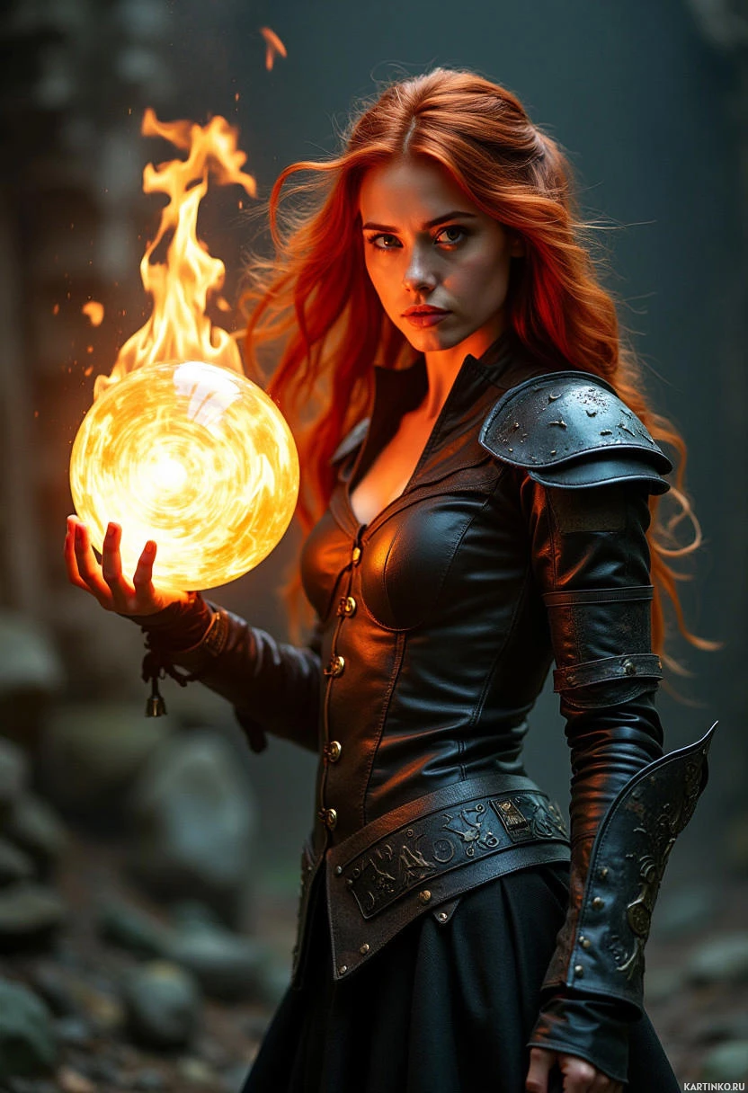 На картинке молодая женщина с огненно-рыжими волосами стоит на фоне, похожего на лесную поляну. На ней черная кожаная броня с золотыми деталями, а в правой руке она держит пылающий огненный шар. Она смотрит прямо в камеру с серьезным выражением лица.