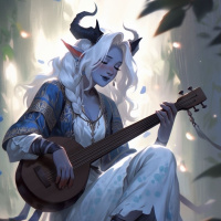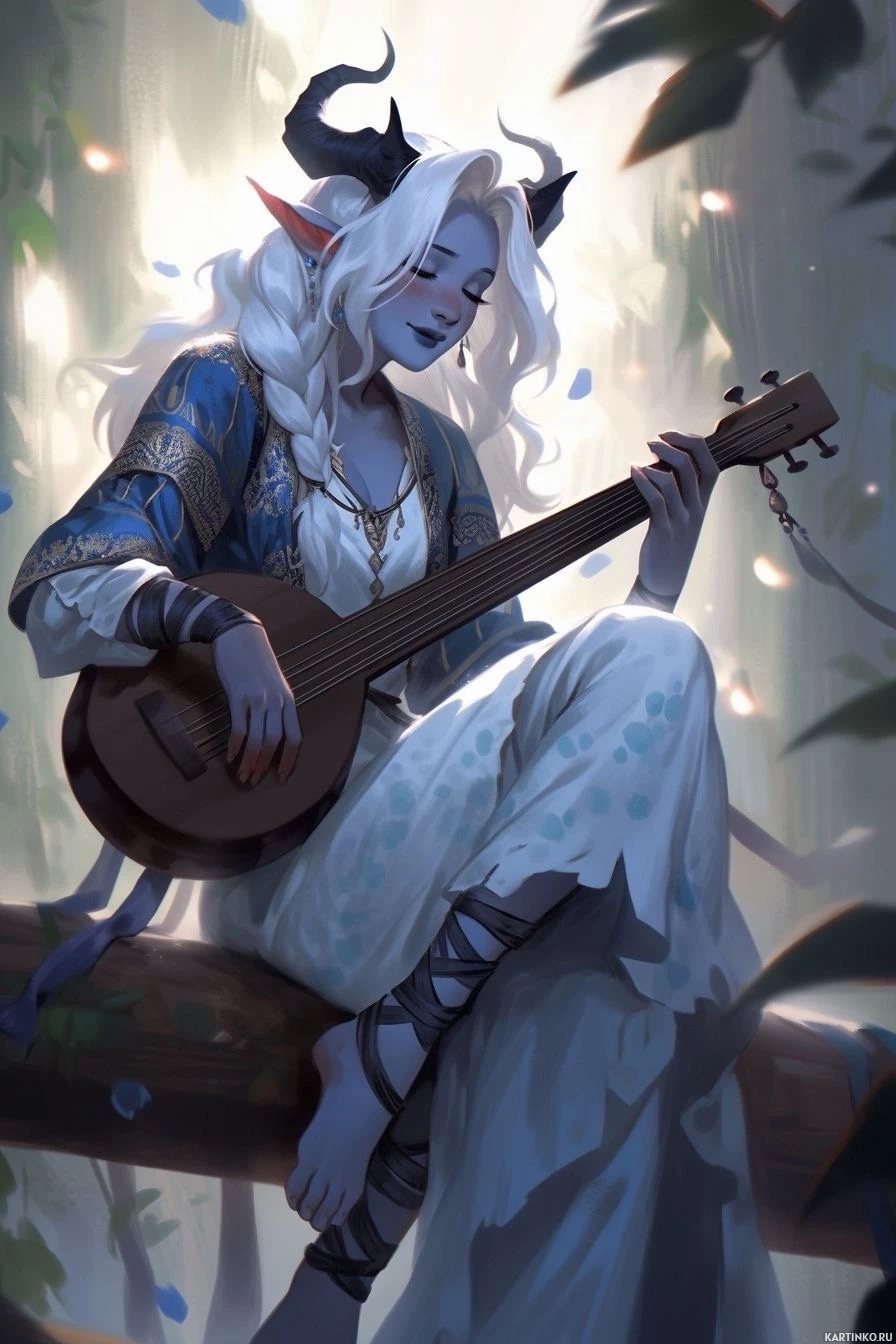 state of mind, as evidenced by the guitar they are holding on their lap. They are seated against a backdrop that resembles a forest, with trees and foliage visible around them. The overall atmosphere of the image is serene and contemplative, suggesting a moment of peaceful musical expression in