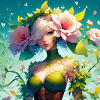 The image features a female character with white hair. She has an elaborate costume that includes green and gold elements, possibly resembling leaves and metalwork. On her head, she wears a floral crown made of pink flowers. Her right hand rests on a plant with similar pink flowers. In the background, there are stars twinkling in a deep blue sky. The overall style of the image is fantastical and appears to be digitally created artwork.