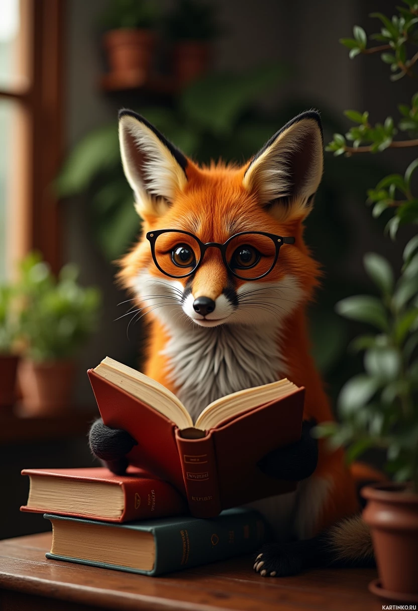 In the image, there is a fox sitting at a desk with a stack of books in front of it. The fox appears to be reading a book that is placed on top of the stack. It has a pair of glasses perched on its nose and its paws are folded together as if it's holding onto something, perhaps another book or papers. The background is a blurred indoor setting with what looks like a window providing natural light, suggesting that this scene might be taking place in a study room or library. There are also some potted plants visible behind the desk, adding to the cozy and studious atmosphere of the image.