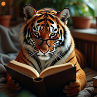 На картинке тигр удобно устроился на пледе, расстеленном на полу, в помещении. На нем очки, а перед ним открытая книга, кажется, он увлечен чтением. По обе стороны от тигра стоят горшки с растениями, добавляя немного зелени в интерьер. Фон мягко освещен, создавая уютную атмосферу.