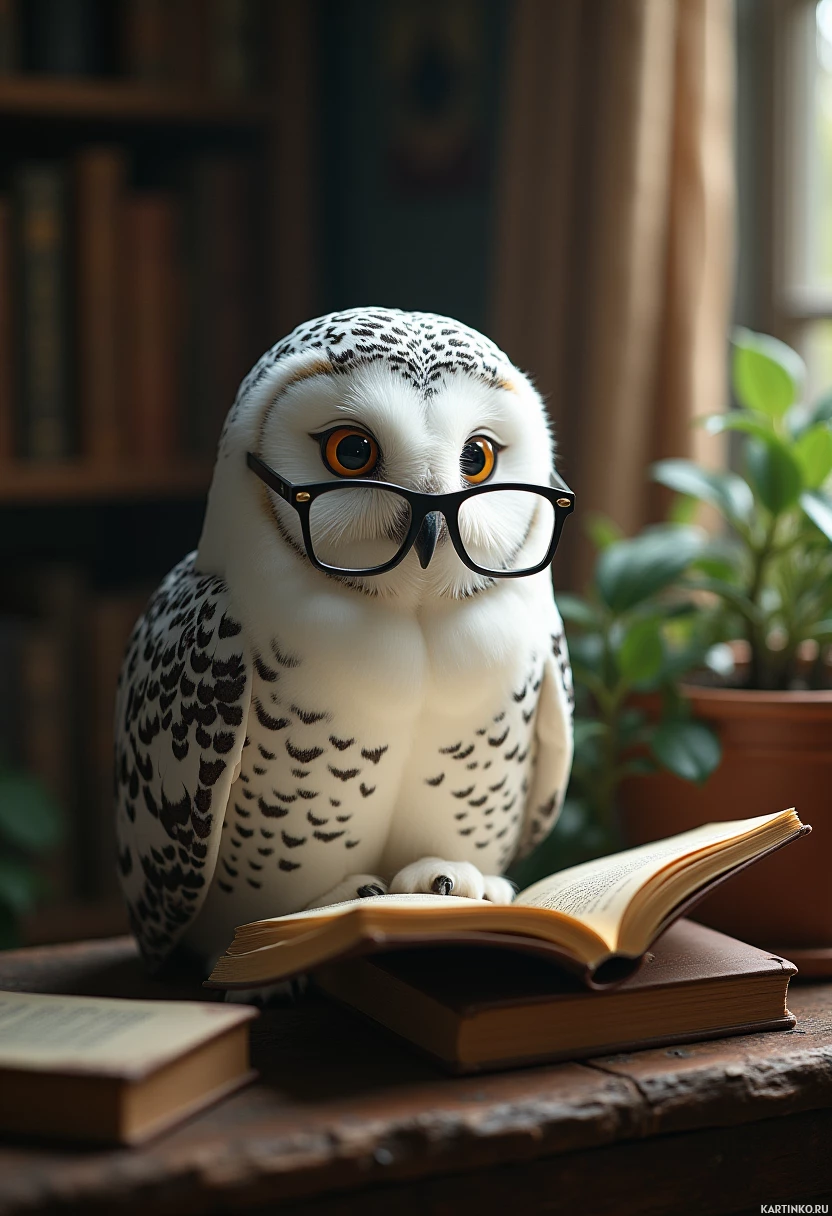 На картинке — игрушечный филин в очках, сидящий на груде книг. Кажется, он читает верхнюю из них. На заднем плане виднеется подобие окна или полка с разными предметами, что указывает на домашнюю обстановку, возможно, предназначенную для учебы или чтения.