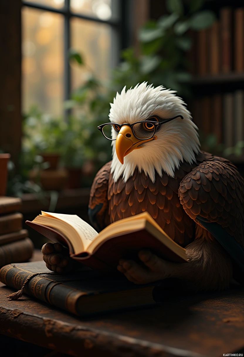 The image depicts an eagle, typically associated with the United States, in a human-like pose. The eagle is wearing glasses and has its head turned to one side as if engaged in thought or reading. It is perched on what appears to be